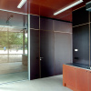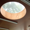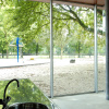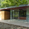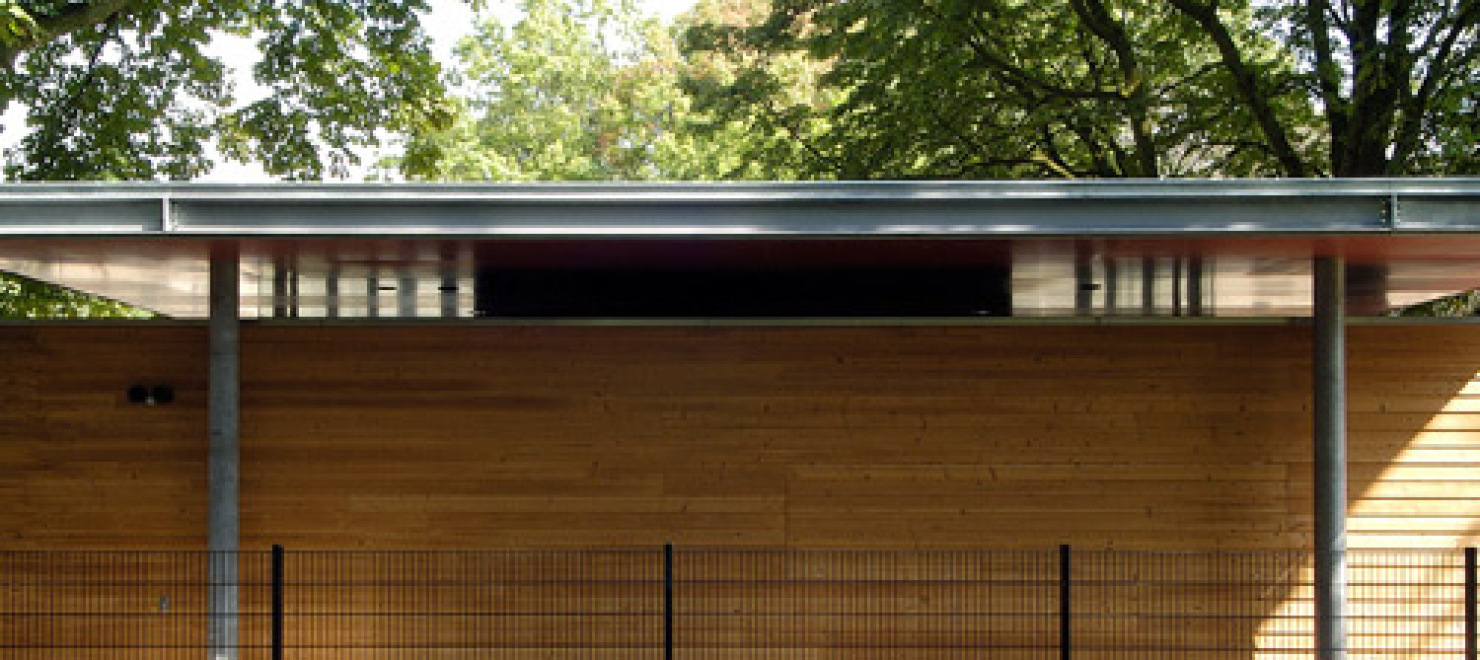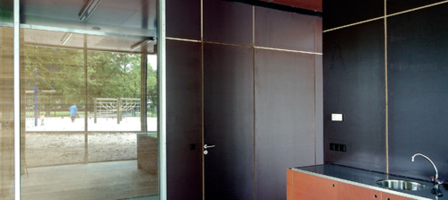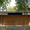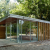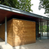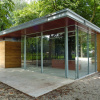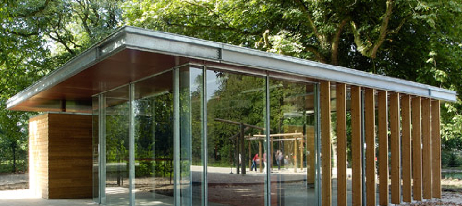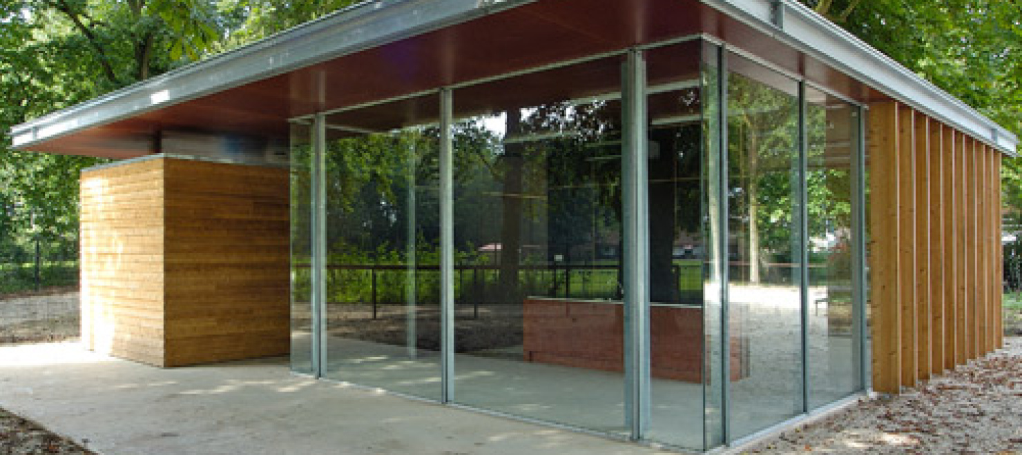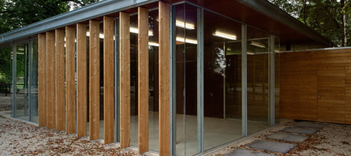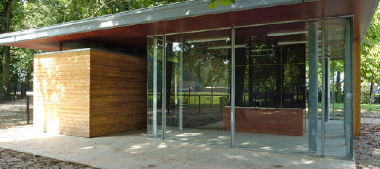 De functionele binnenruimten die geen uitzicht behoeven, zoals de sanitaire ruimten en opslag, zijn aan de dichte zijde gelegen. De open zijde wordt gekenmerkt door glazen puien die de lichtinval optimaliseren. Het paviljoen is opgebouwd uit beton, hout, zink, glas en staal.