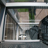 Een nieuw volume aan de linkerzijde van het gebouw in de ‘oksel’ van de voor- en achterbouw bleek de ideale positie op het terrein en maakte tevens de ontsluiting van de kelder technisch mogelijk. zie verder INFO 2 Bewust is gekozen om de nieuwbouw in contrast met de bouwstijl van het bestaande pand op te richten. De nieuwbouw manifesteert zich als een uitstulping waarin het interieur en de gevels van het pand zichtbaar zijn. De transparantie van het spiderglas, de panoramische lift en de roostervloeren evenals de minimalistische neutraliteit van de structuur en het detail zijn kenmerken die in het ontwerp zijn beoogd. De grote studio op de begane grond is ontworpen als een doos-in-doosconstructie. Geluidsnivo’s tot meer dan 95 dbA hinderen de andere studio’s niet noch de buurt. Op zich als gerealiseerd resultaat een technisch hoogstandje.