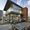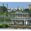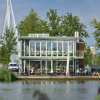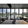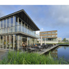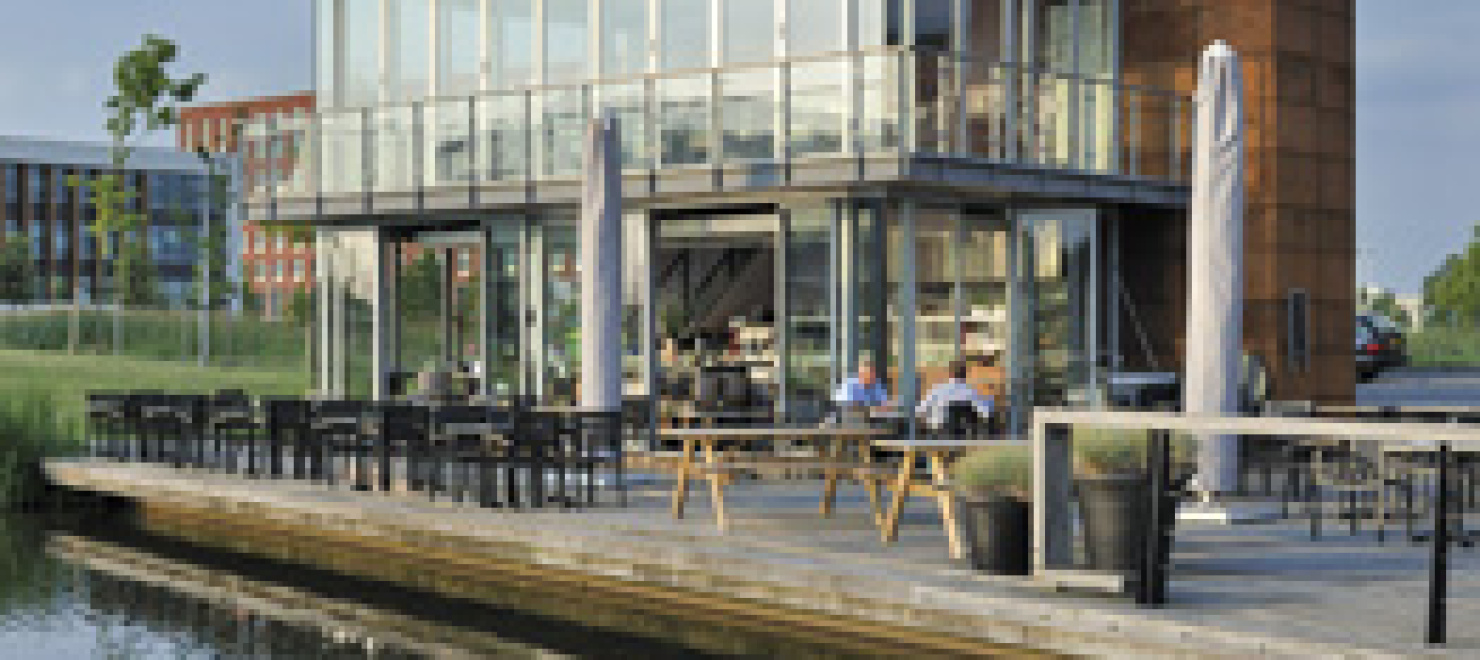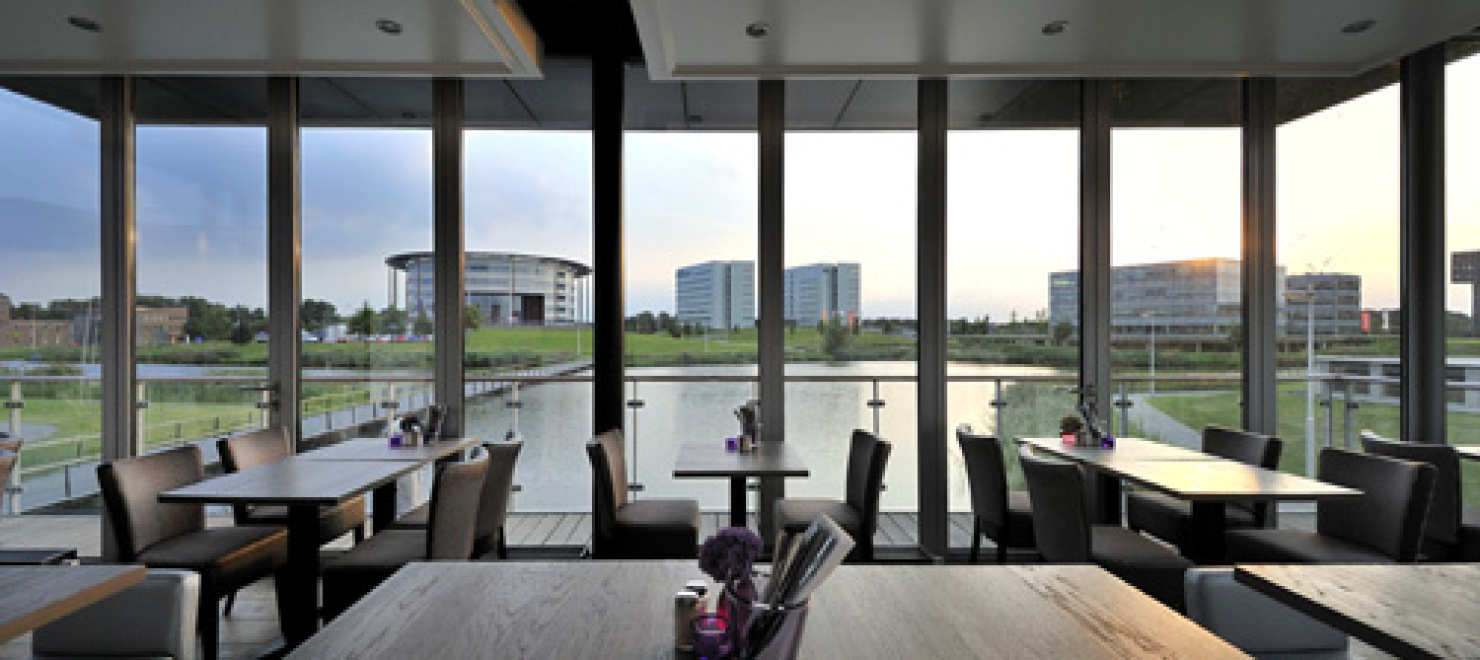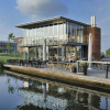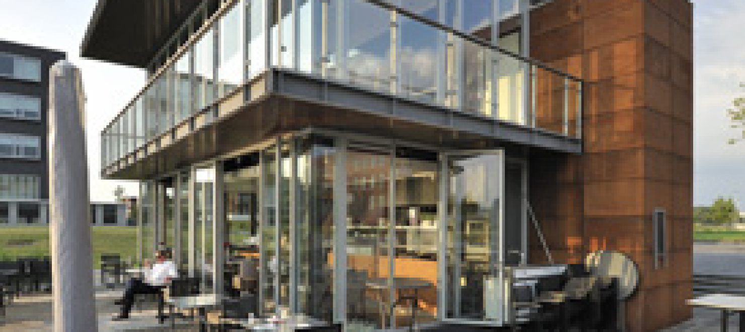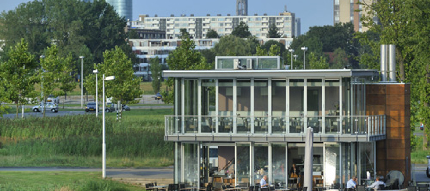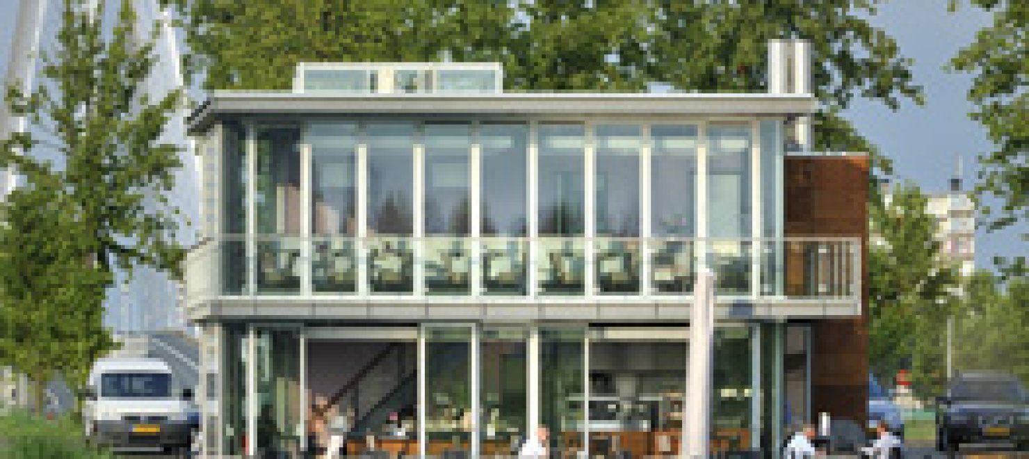 zie verder INFO 2 In de rechthoekige gesloten kern zijn de functionele vereisten van het paviljoen ondergebracht. De kern steekt in een glazen doos, dat beëindigd wordt met een ruim overstekend dak. Het paviljoen beslaat twee bouwlagen waar gasten een 270˚ uitzicht hebben over het water, de parkomgeving en de omringende gebouwen. De compacte keuken, opbergruimte, garderobe en toiletten zijn integraal opgenomen in de kern van het paviljoen waardoor de vrije vloer ruimte biedt aan de gasten. Een ingetogen vormentaal en menselijke schaal geven het paviljoen een hoogwaardige uitstraling.