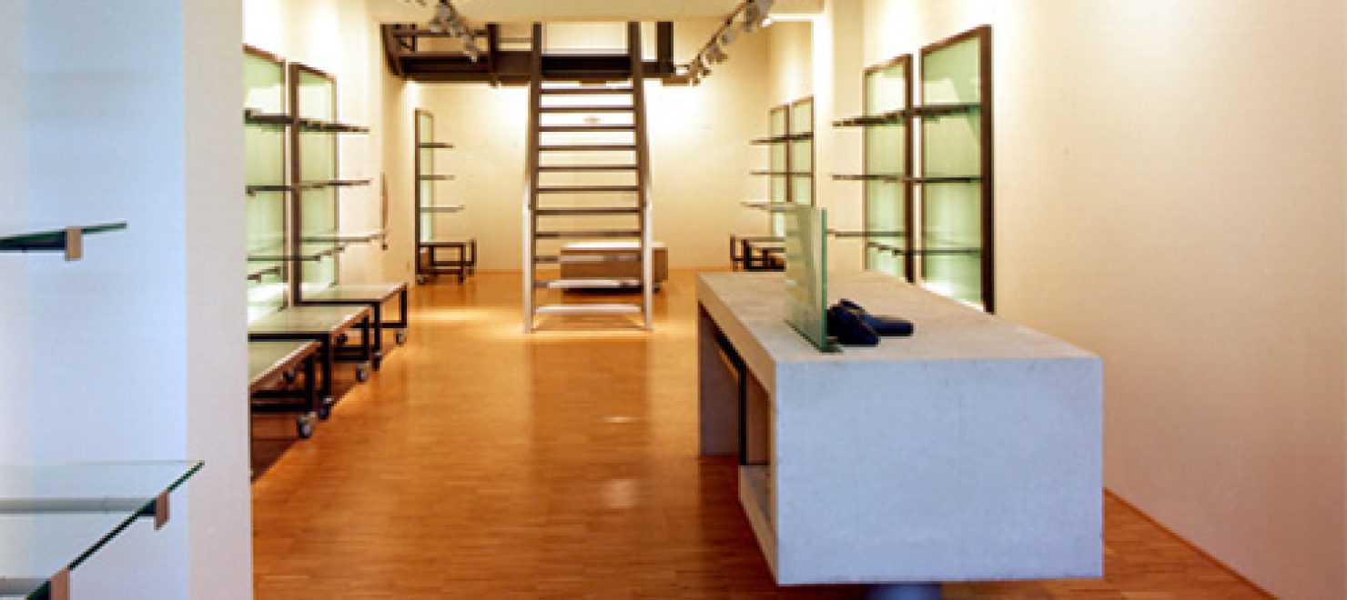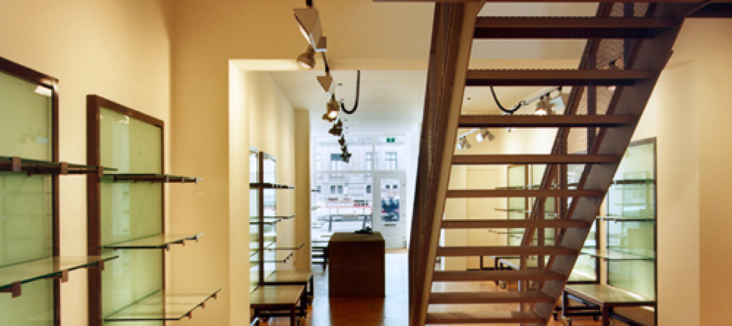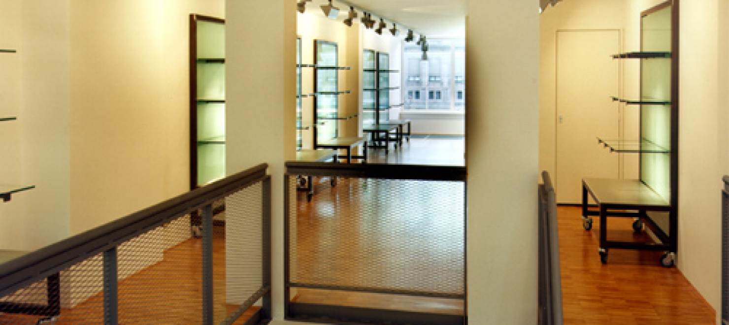 Het winkelinterieur voor de Italiaanse tassenlijn MHWay is ontworpen als een ‘gesamtkunstwerk’. De vaste en losse inrichting vormen een eenheid, waarin de producten zich onderscheiden en afzonderlijk tot hun recht komen. Ondanks het standaard winkelconcept van MHWay, werd in het winkelinterieur aan het Rokin eenduidig een eigen ontwerpconcept doorgevoerd. Net als in de tassen van MHWay, die zich karakteriseren door het gebruik van vernieuwende materialen en verrassende detaillering, is in het interieur gekozen voor duurzame materialen en ver doorgevoerde, eigenhandig doorgedetailleerde meubels. zie verder INFO 2 Het interieur is eerst tot cascowaarde gesloopt waarna er over twee verdiepingen een vrije plattegrond gerealiseerd kon worden. De trap en balie zijn de twee grote vaste meubels in de winkel. Met losse elementen, de verrijdbare displays, kan de routing bepaald en aangepast worden. De transparante, stalen trap die geconstrueerd is door middel van een zwevende hangconstructie, maakt een geheel kolomvrije ruimte mogelijk. De verrijdbare displays van glas, staal en beton vormen in vormgeving en uitstraling een consequente voortzetting van het vaste interieur.