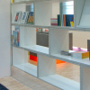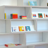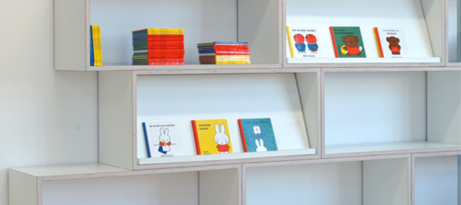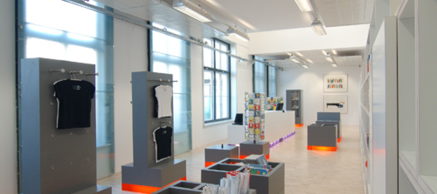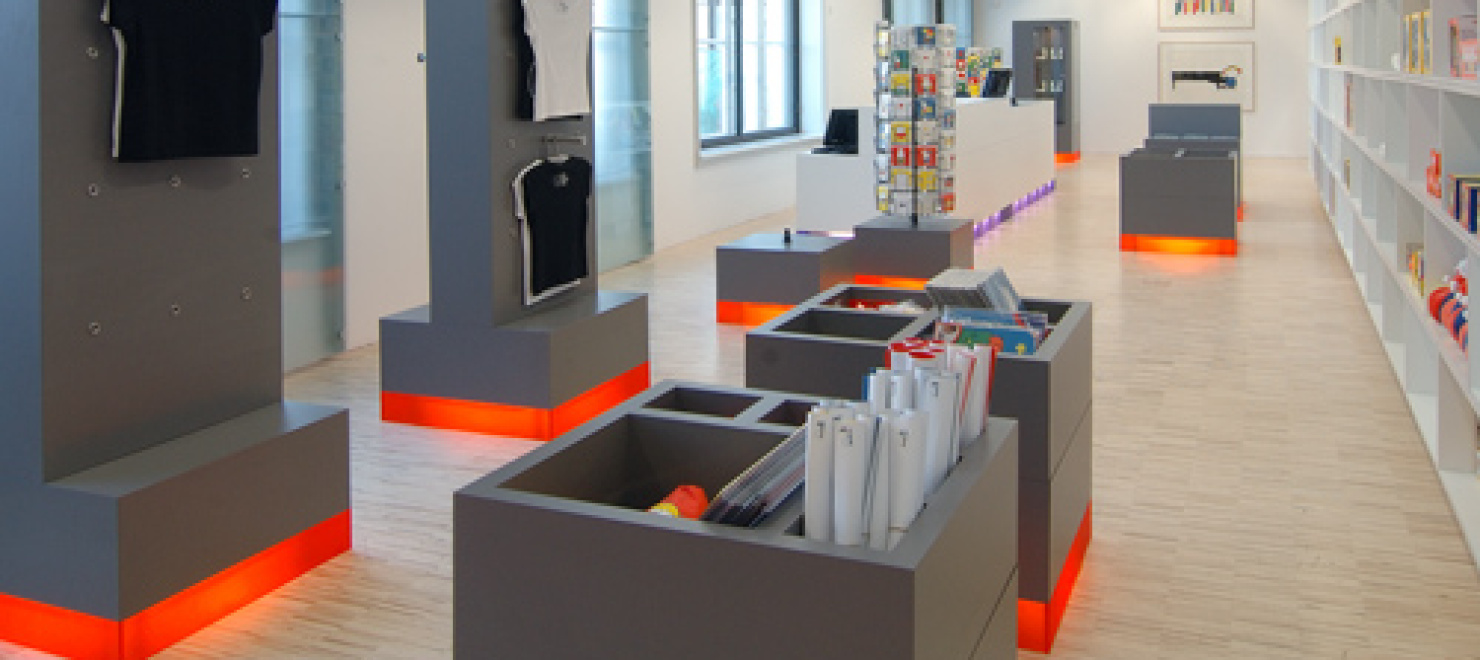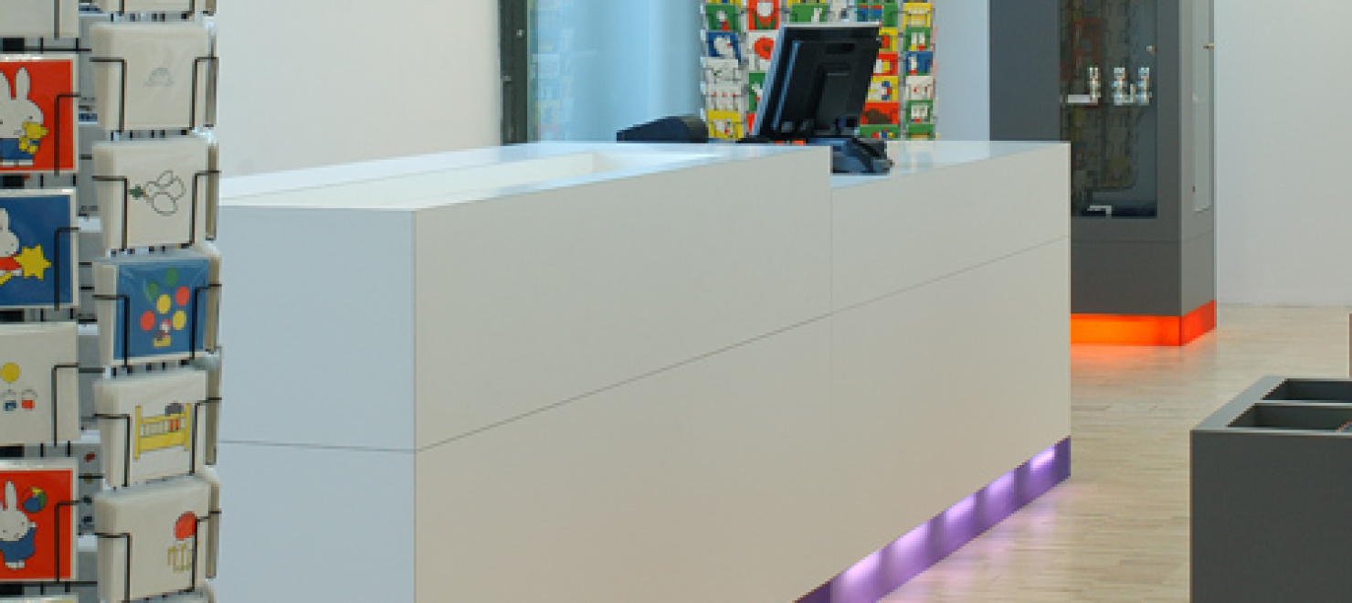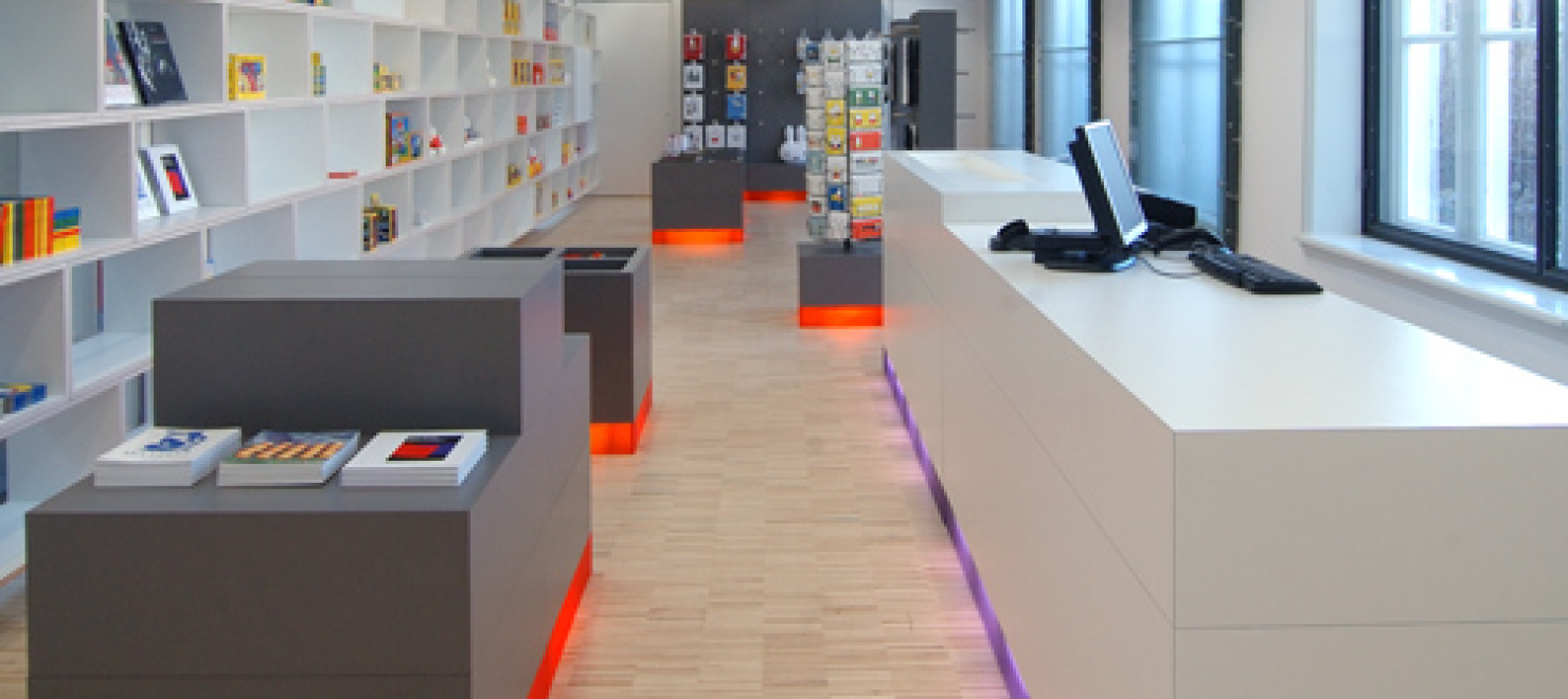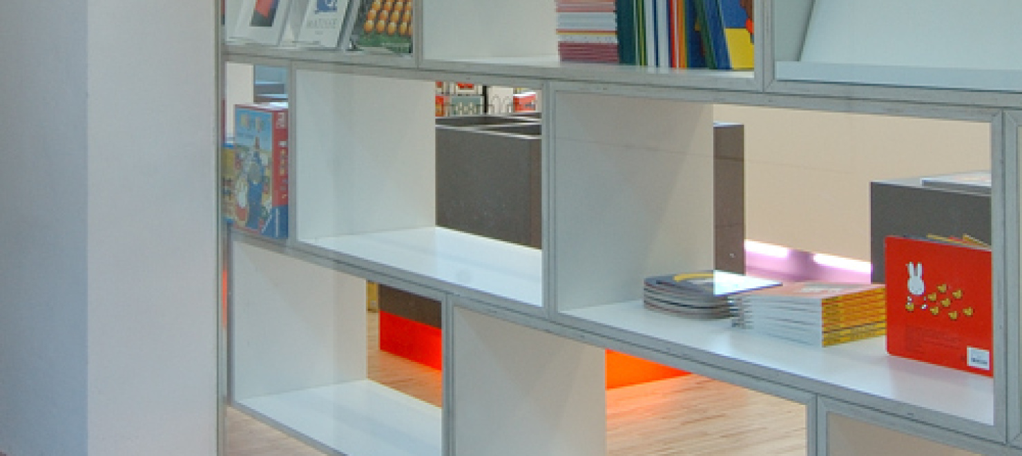 Wie de entree van de voormalige Altrechtvleugel van het Centraal Museum binnenloopt op weg naar het dick bruna huis heeft direct zicht op de nieuwe museumwinkel. De zogenaamde CM Studio-museumvleugel die aansluit op het dick bruna huis is, na de ingreep die wij in 1999 realiseerden, nu opnieuw door ons verbouwd en ingericht. Voor de winkelinrichting is gekozen voor een strakke en moderne uitstraling. Met als doel de enorme verscheidenheid aan kleine producten te ordenen is een langgerekt wandmeubel bedacht dat de wand van de gang grotendeels afdekt. zie verder INFO 2 In de scheidingswand tussen de winkel en de gang zijn grote sparingen aangebracht waardoor de displayelementen van het wandmeubel als vitrines in de gang zichtbaar worden.De displaymeubelen en de balie zijn opgebouwd uit modules in een vast maatstramien. Er is geen ordening naar hiƫrarchie, er is louter schaal en ritme. Het totale palet van materialen is sober en neutraal gehouden, wit en grijs. De indeling en routing zijn willekeurig en worden bepaald door de groepering van artikelsoort. Voor de verlichting is gekozen voor floodlight door de paarse en oranje transparante plinten. De meubels lijken hierdoor te zweven boven de serene houten lattenvloer. In een natuurlijke en ingetogen ambiance gaat de aandacht naar de artikelen zonder deze aan een zware theatrale uitlichting bloot te stellen.